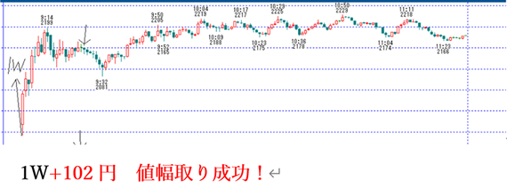★225デイトレ会員向け解説レポートからノウハウ部分と特別に設定したチャートを割愛したもののため一部伏字、またチャートもロウソク足と出来高以外は略してあります。